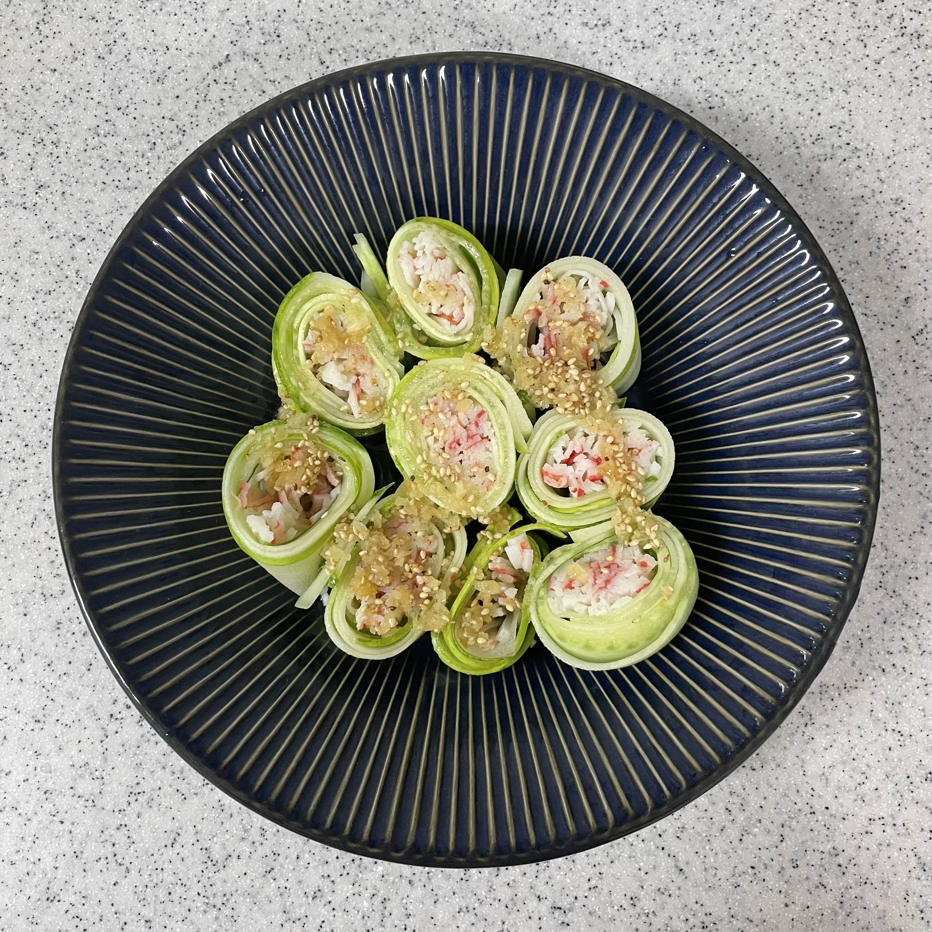 - 오이1/2를 겹쳐 놓고, 크래미 2개 분량을 김밥 재료 넣듯이 넣어 오이를 김밥 말듯이 말아준다.