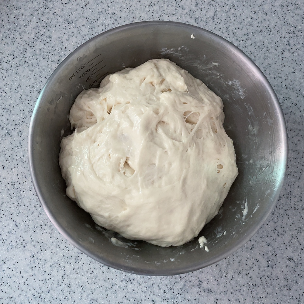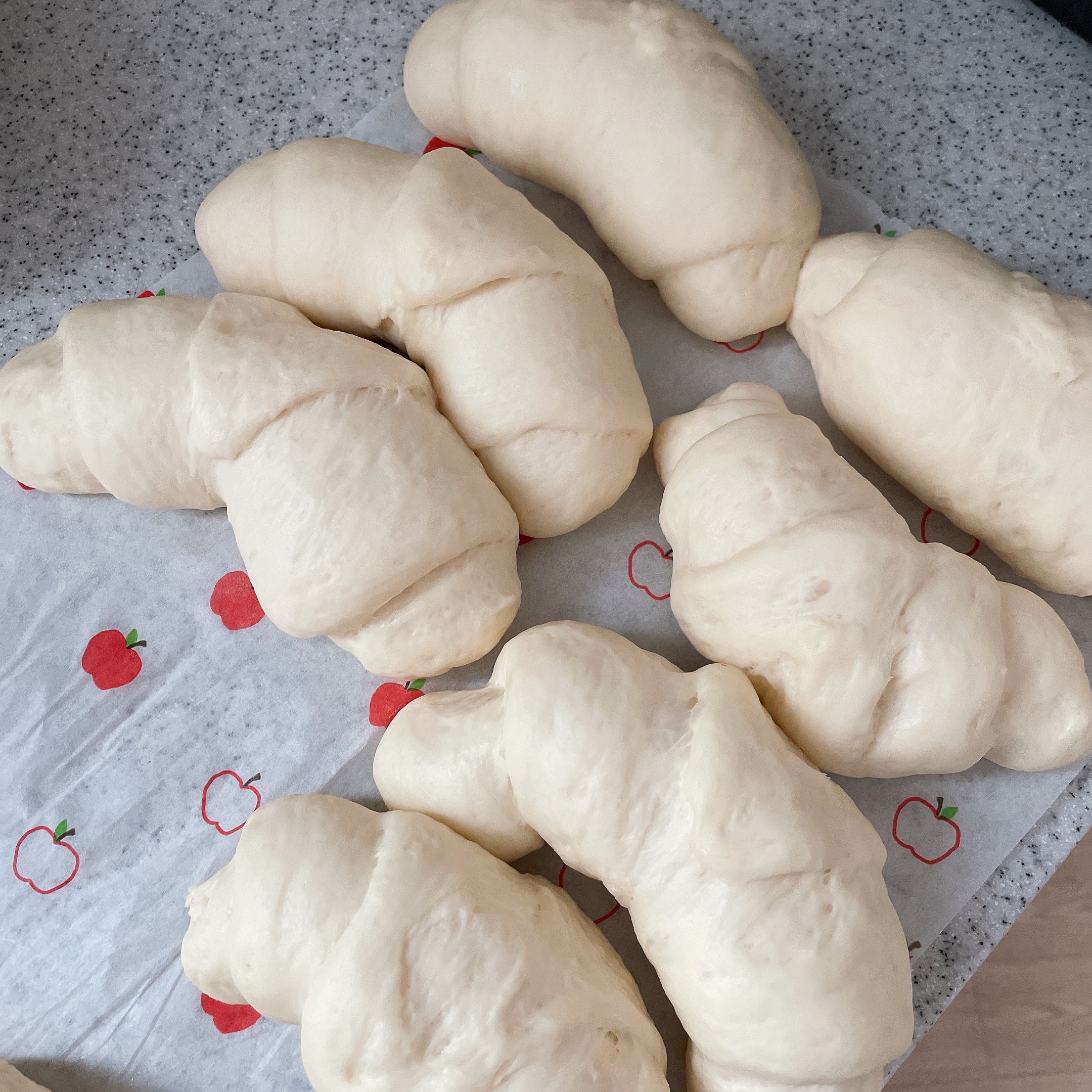 재료: 중력분 150g, 물 60g, 우유 40g, 이스트 2g, 소금 2g, 설탕 5g, 버터 10g