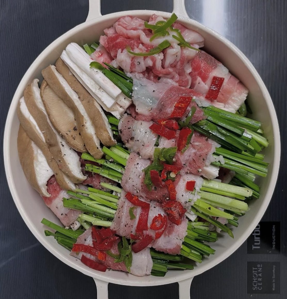 3. 냄비에 양배추를 먼저 넣고 그 위에 우삼겹과 버섯을 올린다.