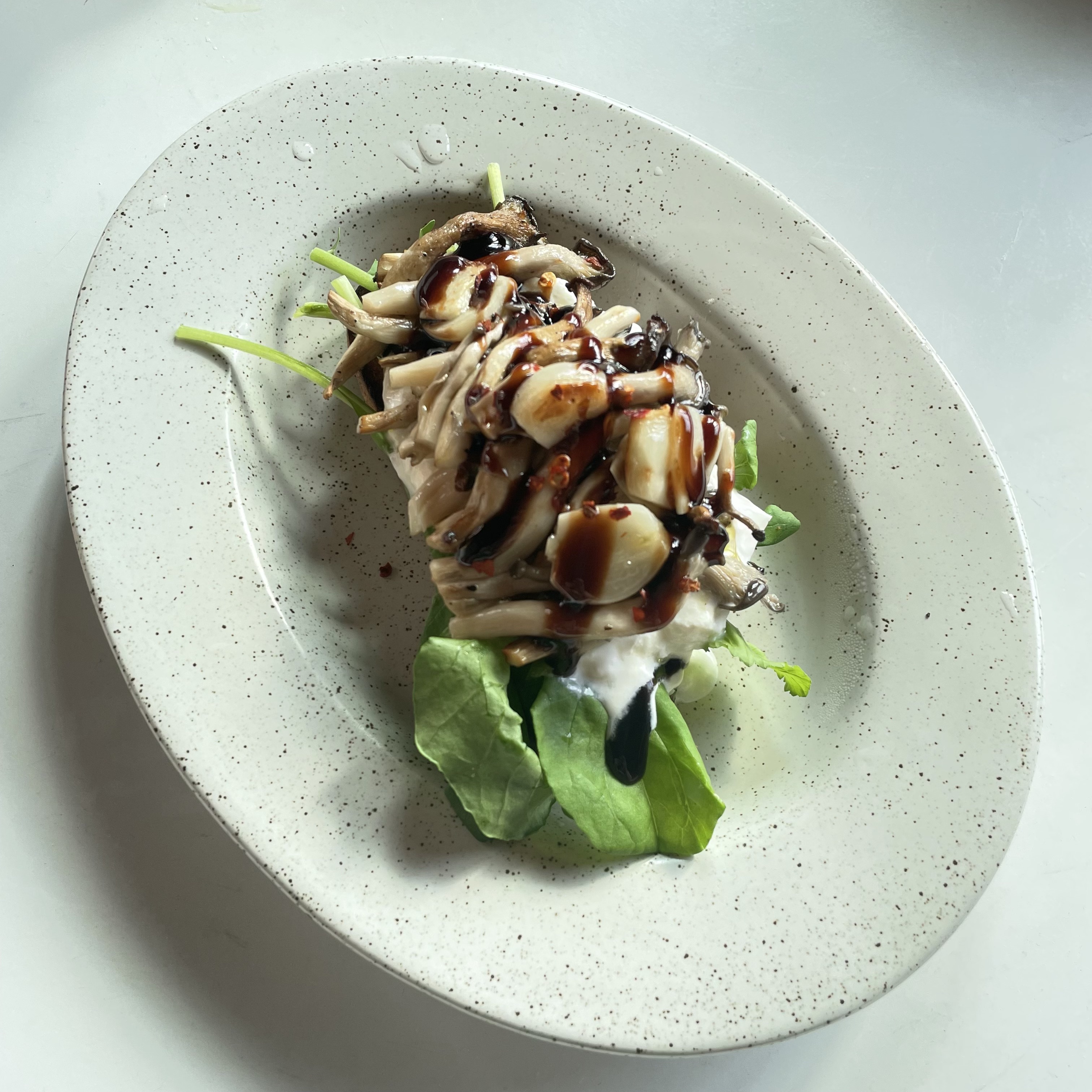 재료: 깜빠뉴 1장, 부라타 치즈 1개, 느타리 버섯 1팩, 마늘 5개, 루꼴라 40g, 크러시드 레드페퍼, 올리브유, 후추 약간, 소금 약간, 발사믹 글레이즈