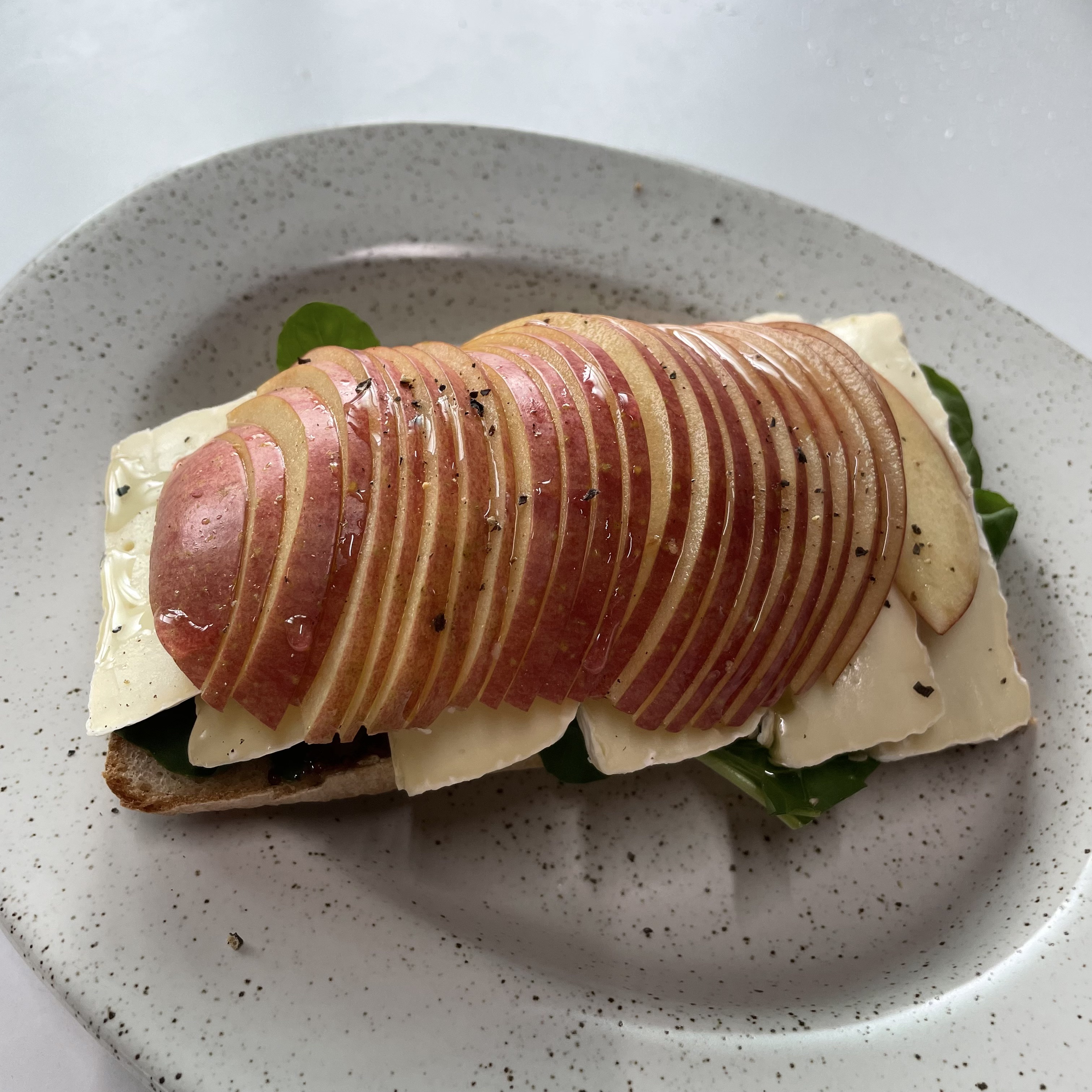 5. 루꼴라를 올리고 순서대로 브리치즈와 사과를 올려준다.