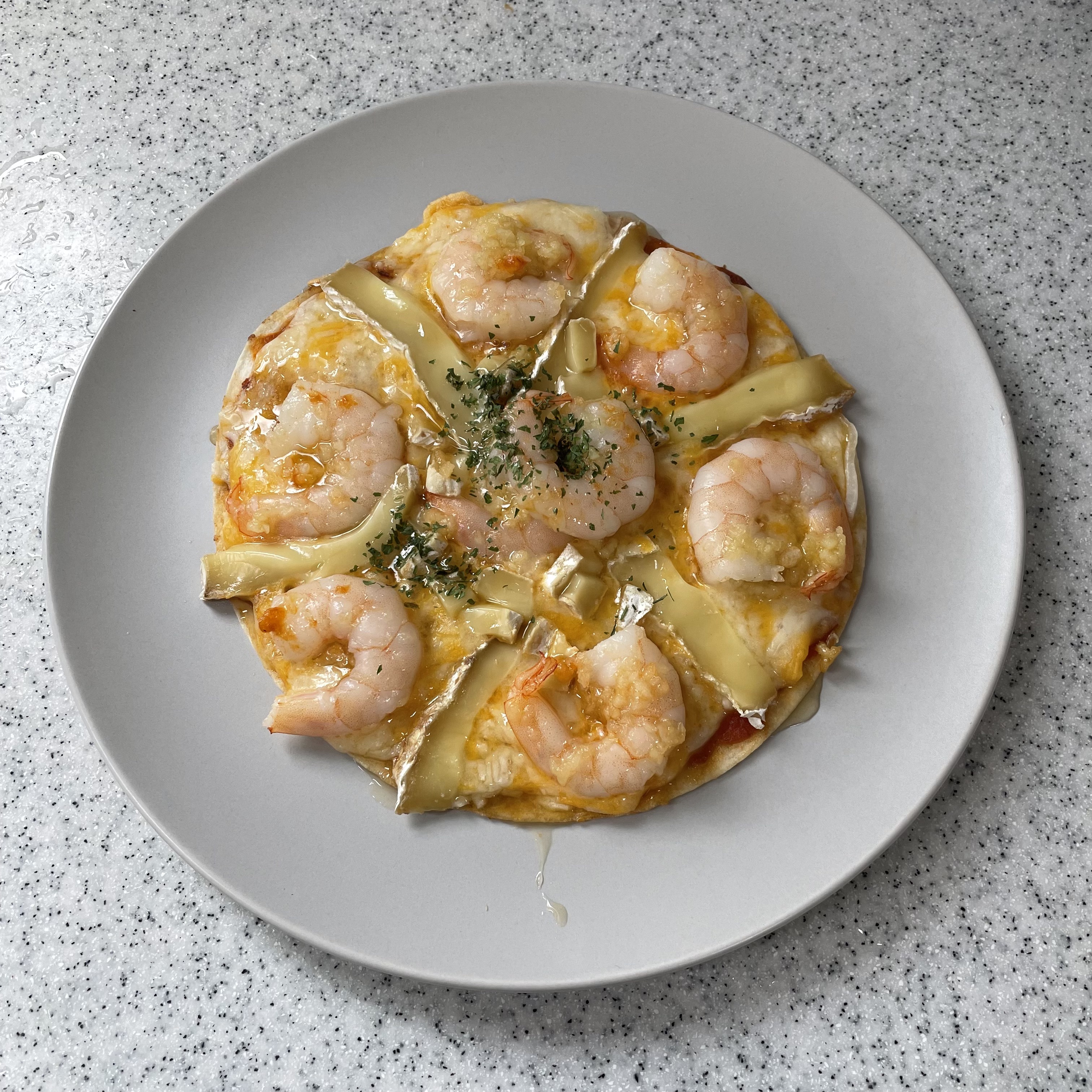 재료: 또띠아 1장, 새우 (중) 7마리, 양파 반 개, 모짜렐라 치즈, 슬라이스 치즈, 브리치즈 (옵션), 파슬리 (옵션)