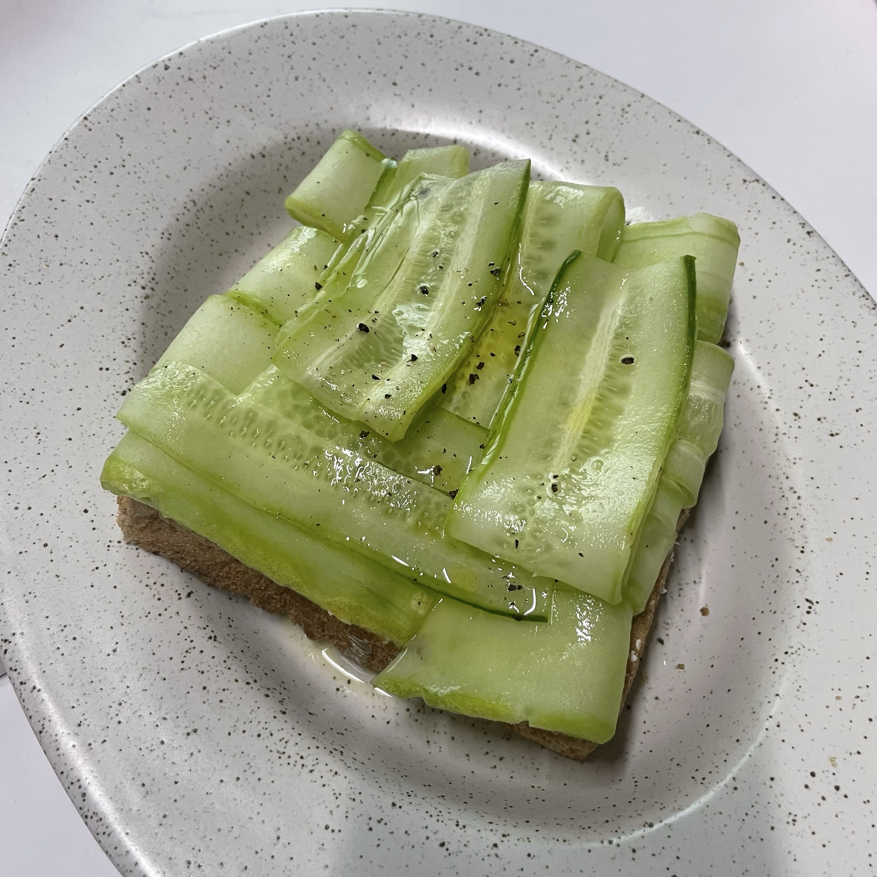 - 바싹 구운 빵에 그릭요거트 발라 주고, 오이를 가지런히 올린다.