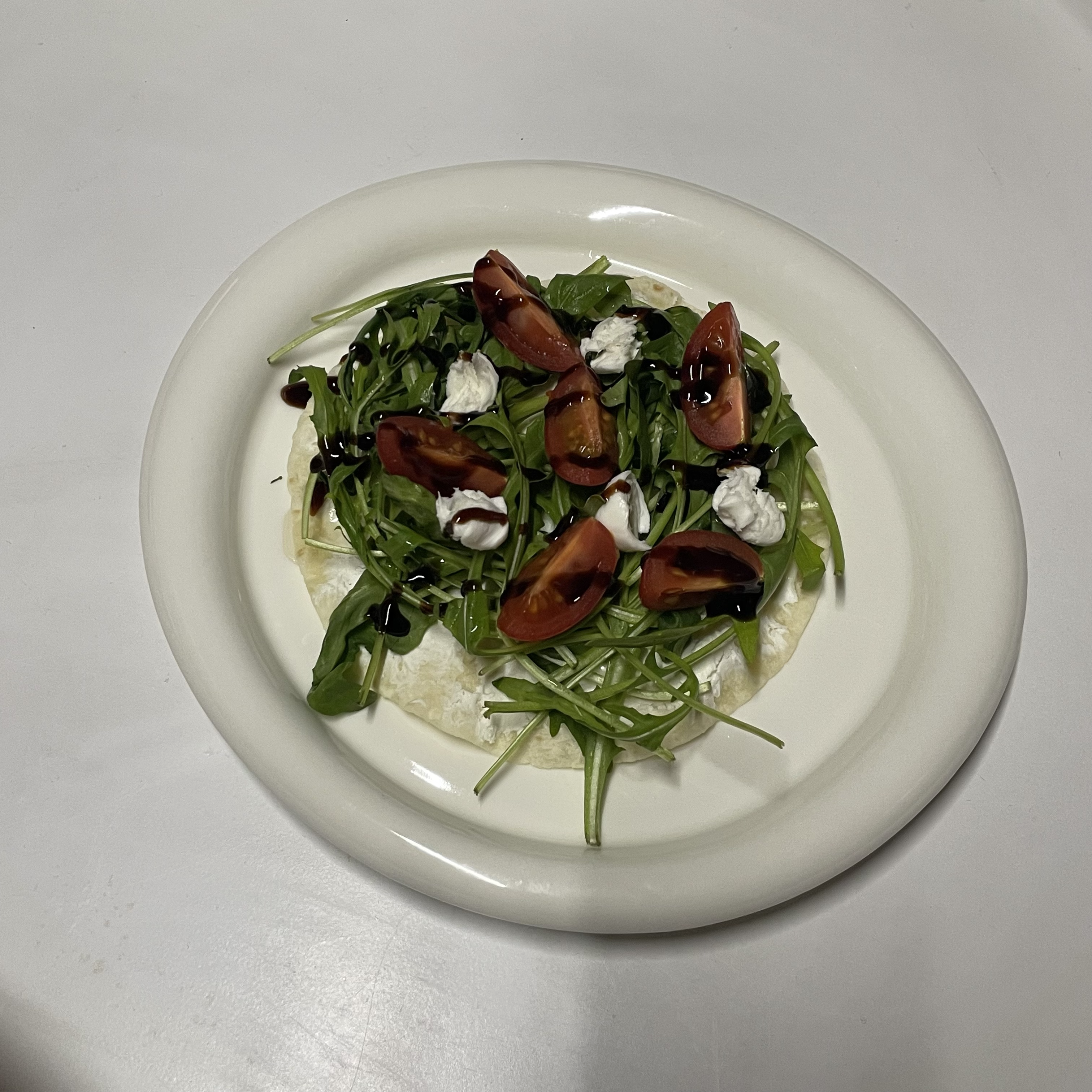 재료: 루꼴라 한 줌, 방울 토마토 5-6알, 통밀 또띠아 1장, 그릭 요거트, 꿀, 발사믹 글레이즈, 그라나 파다노 치즈 (옵션)