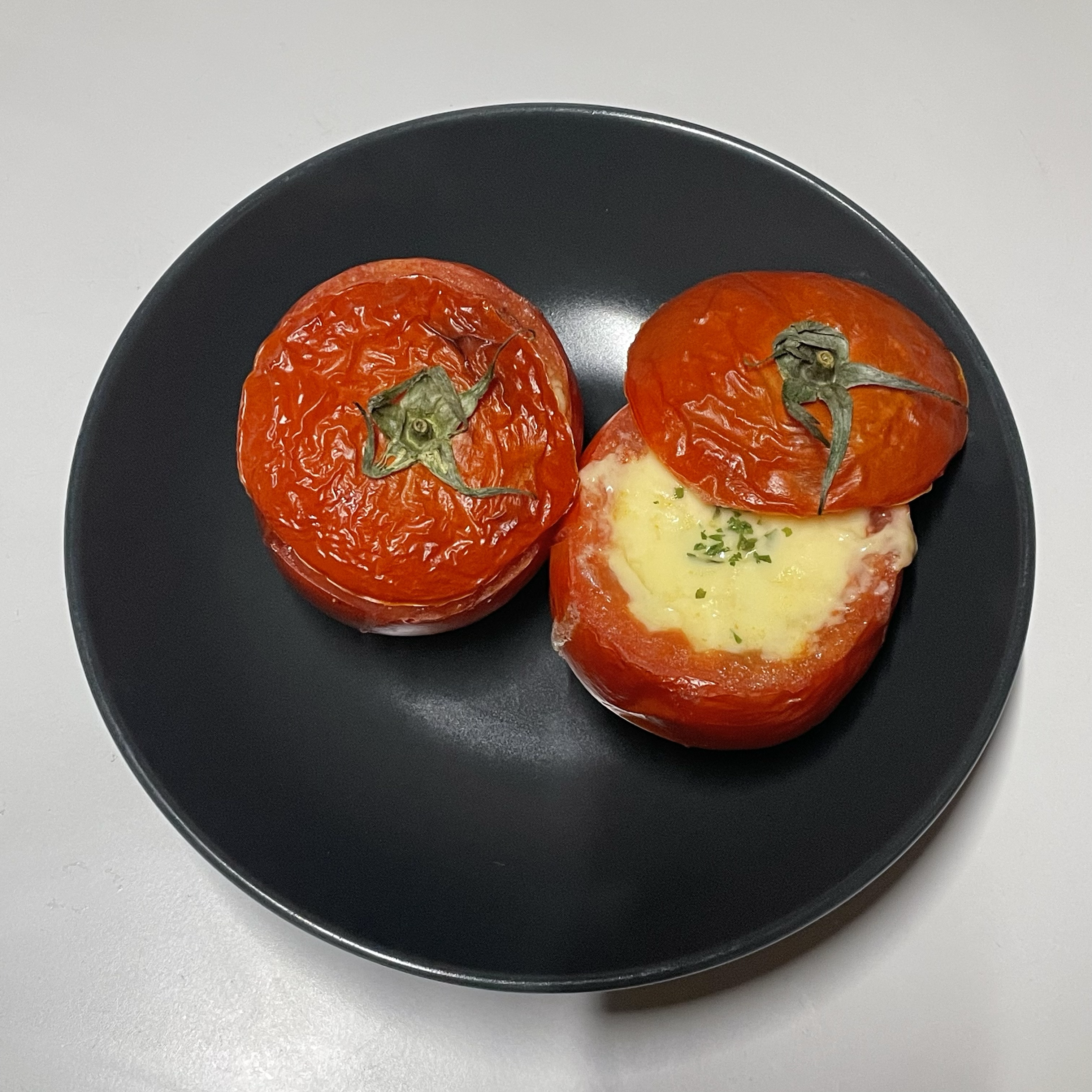- 토마토 안에 볶은 재료를 넣어준 뒤, 모짜렐라 치즈와 파슬리를 뿌리고 에어프라이어 180도 15분 돌려준다.
