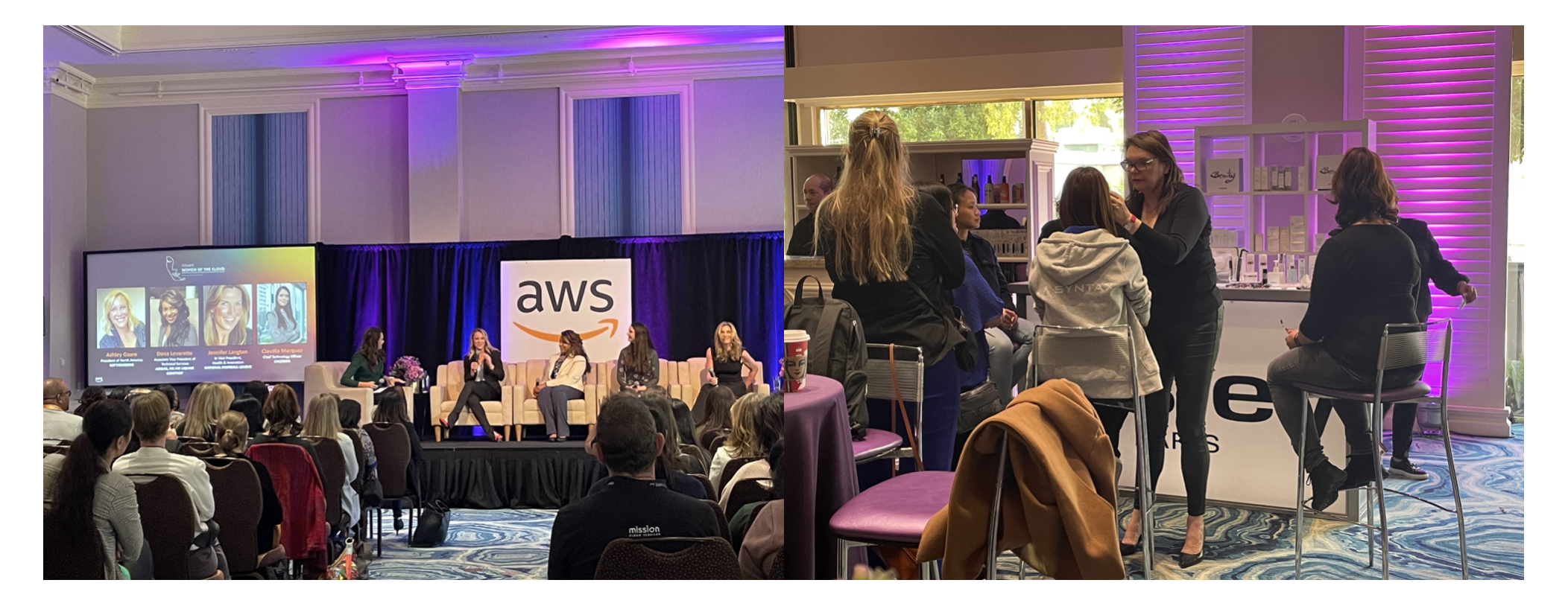 바로 Women of the Cloud라는 세션이었습니다. AWS에 근무하는 여성들과 함께 토크쇼 형식으로 진행하는 세션이었는데요. 세션 뒤에서는 메이크업과 증명사진까지 찍어주더라고요 👩🏻🎓