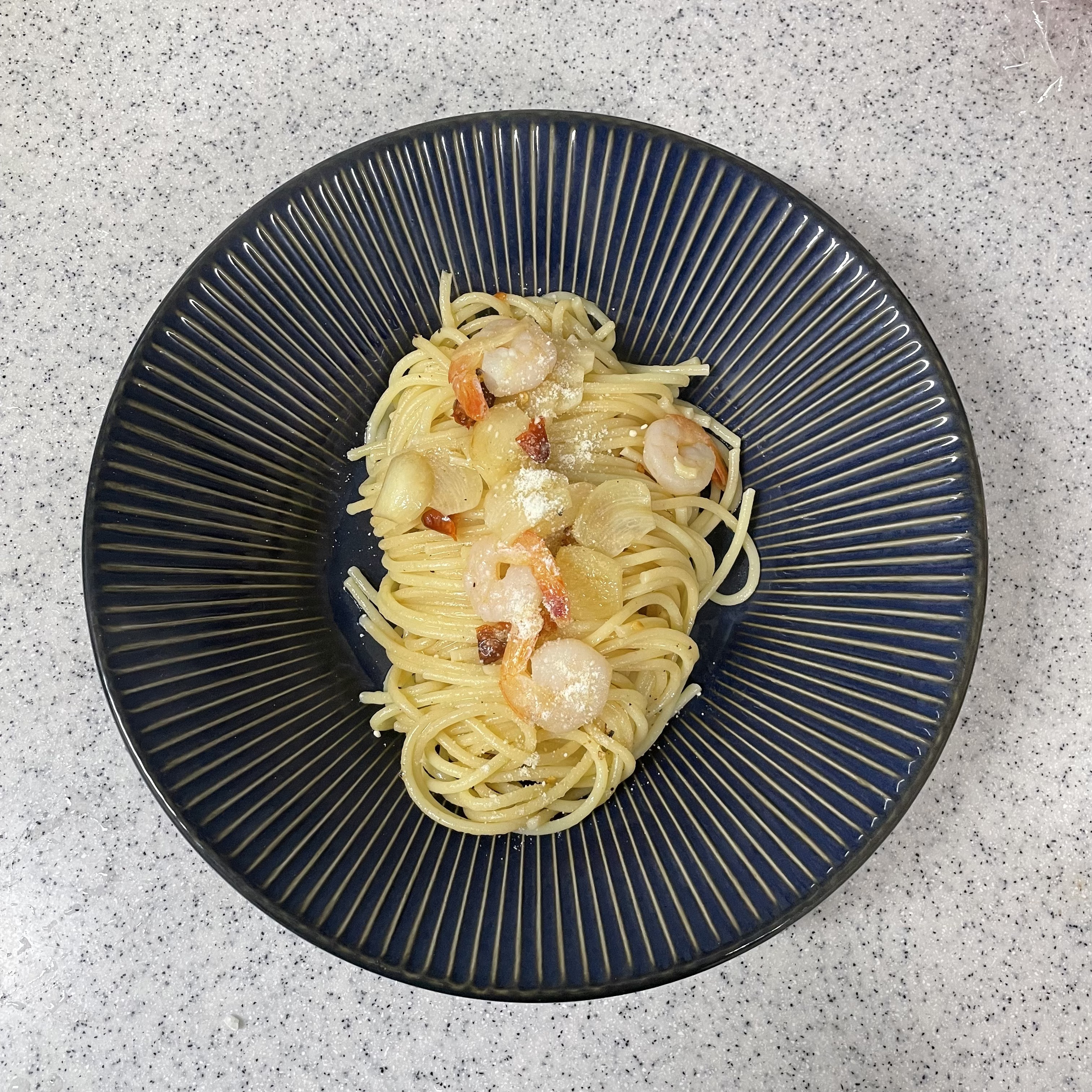 - 후라이팬에 올리브유를 가열하고 2-3분 정도 후에 편썬 마늘과 페퍼론치노를 볶는다. (이때 새우를 넣고 익힌다.)