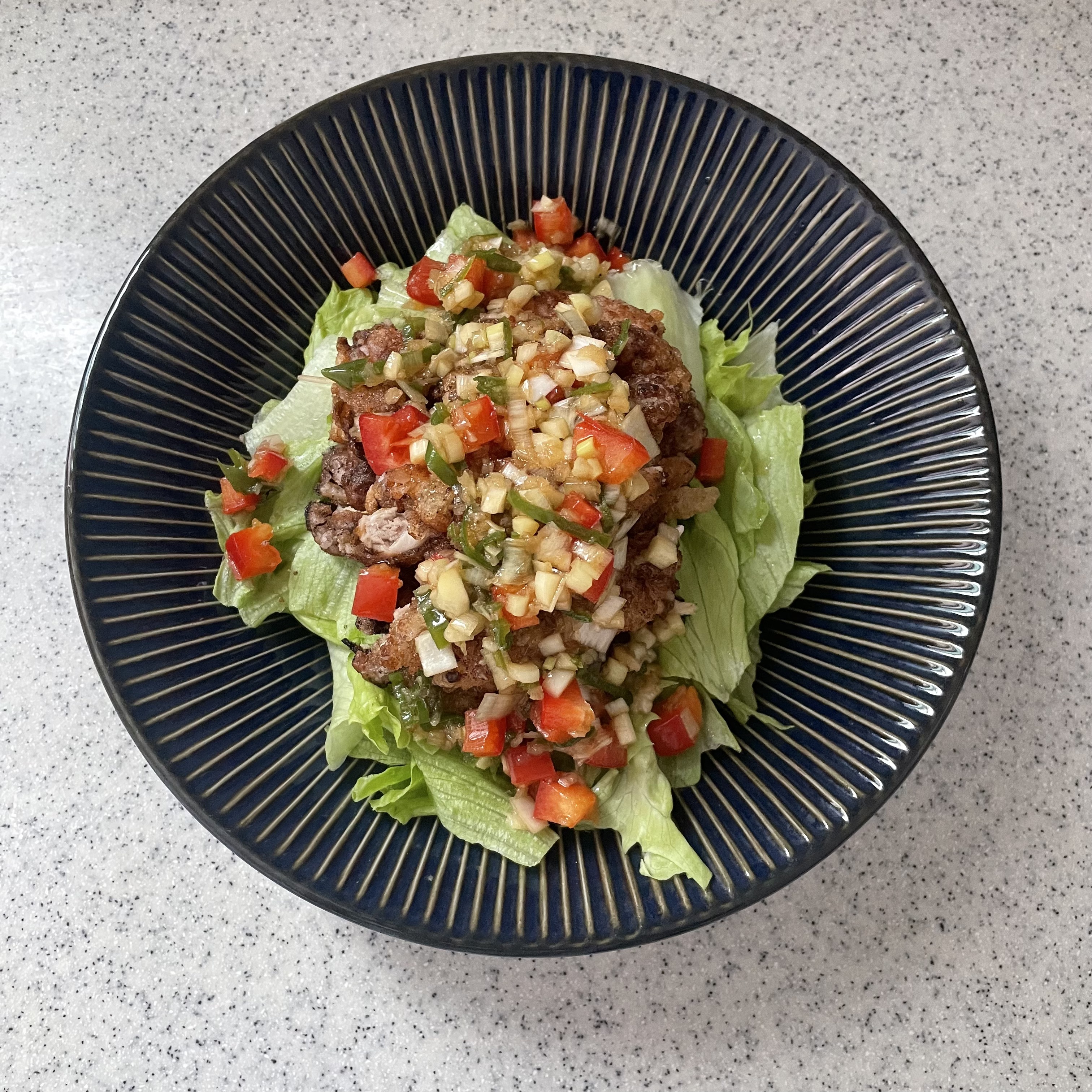 - 그릇에 양상추를 깔고 그 위에 튀긴 닭고기를 한 입 크기로 썰어 올려준다.
