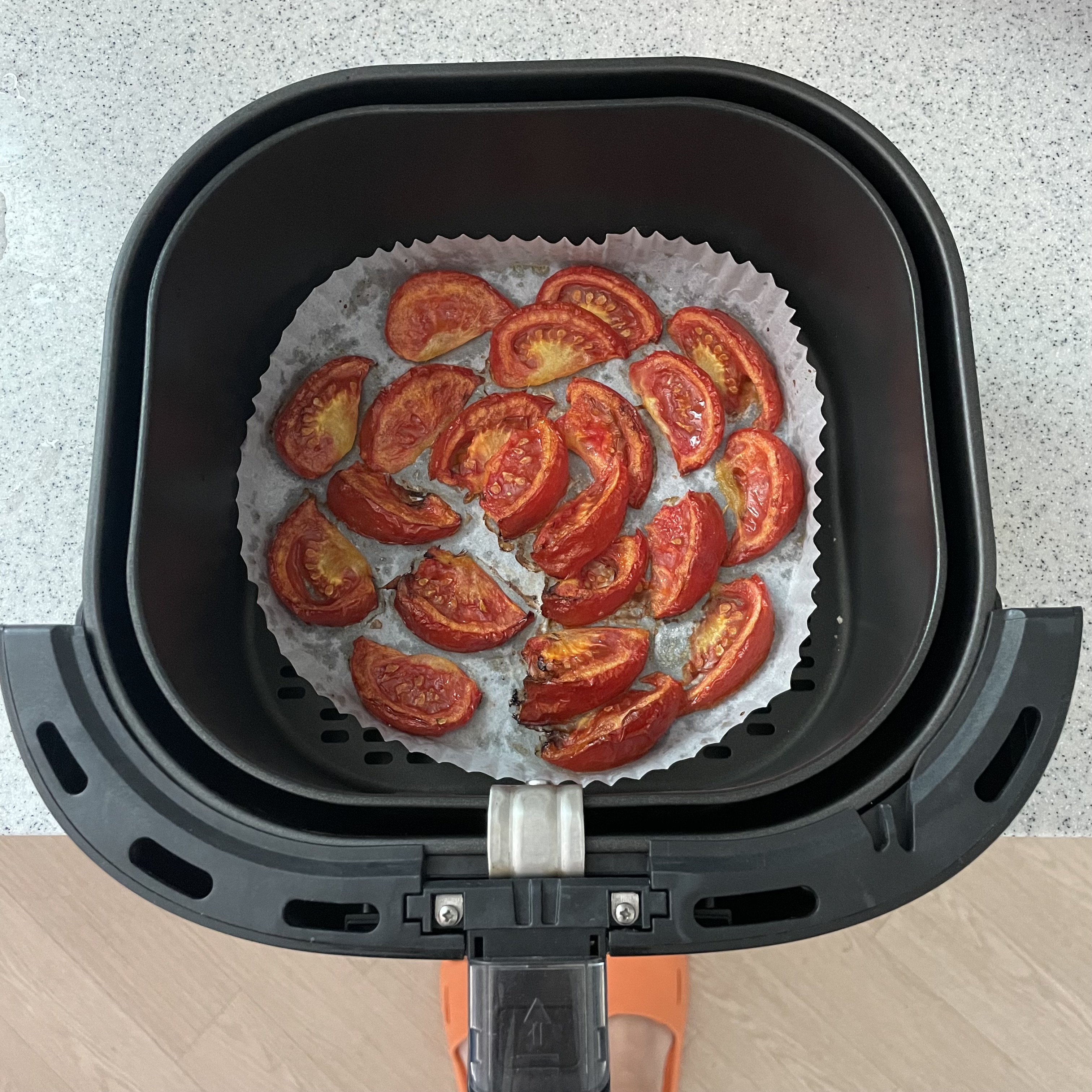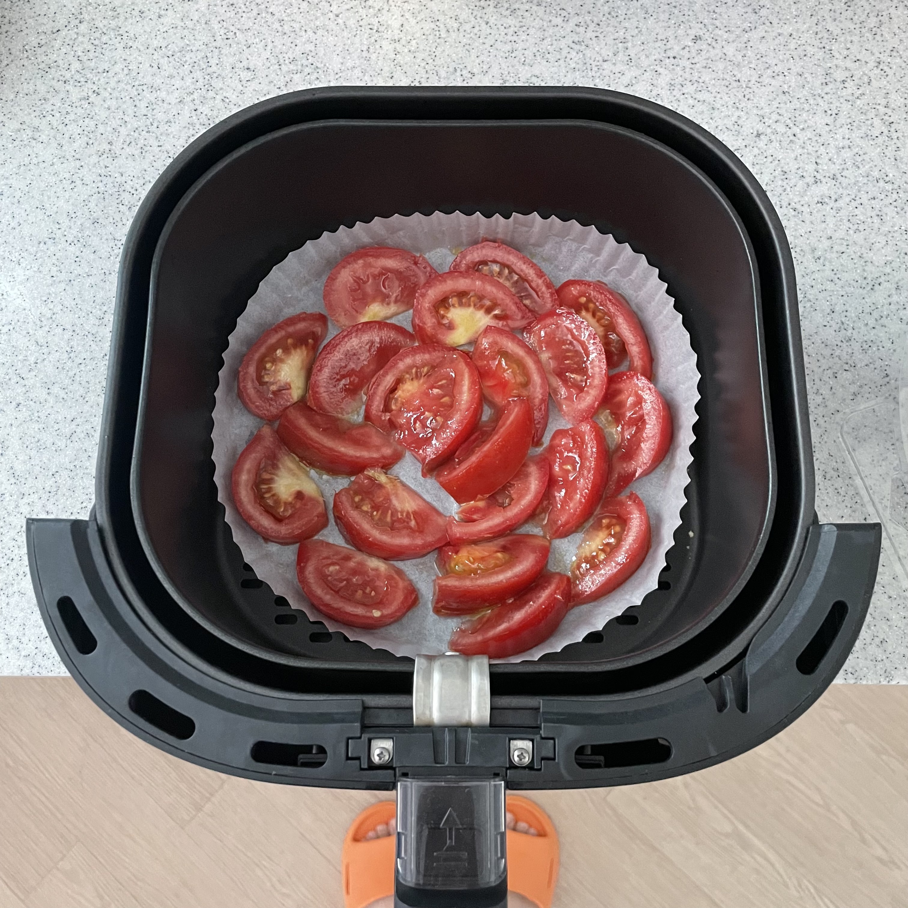 - 오븐이나 에어프라이어에 토마토를 넣는다. (방울 토마토는 과육 부분이 위로 가도록 놓는다.)