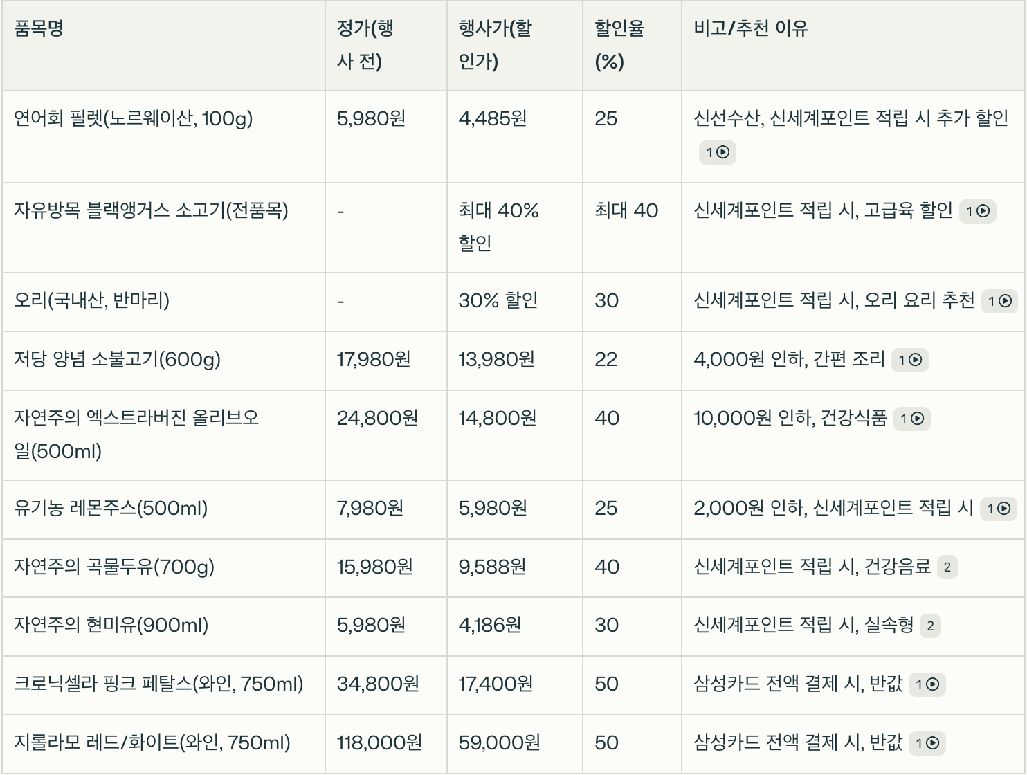 아래는 이마트 6월 20일~26일 전단행사에서 정가(행사 전 가격) 대비 할인율이 높고, 실제로 살 만한 주요 상품을 한 표로 정리한 것입니다.