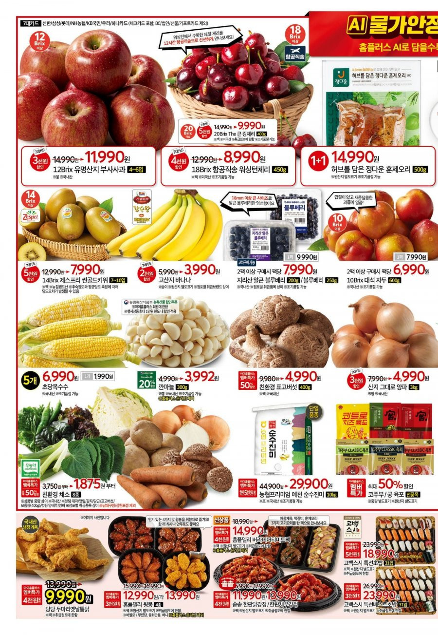 - 신선식품: 감자, 참외, 복숭아, 체리, 바나나, 옥수수 등 제철 과일·채소 대량 특가, 50% 할인 및 묶음 특가 다수.