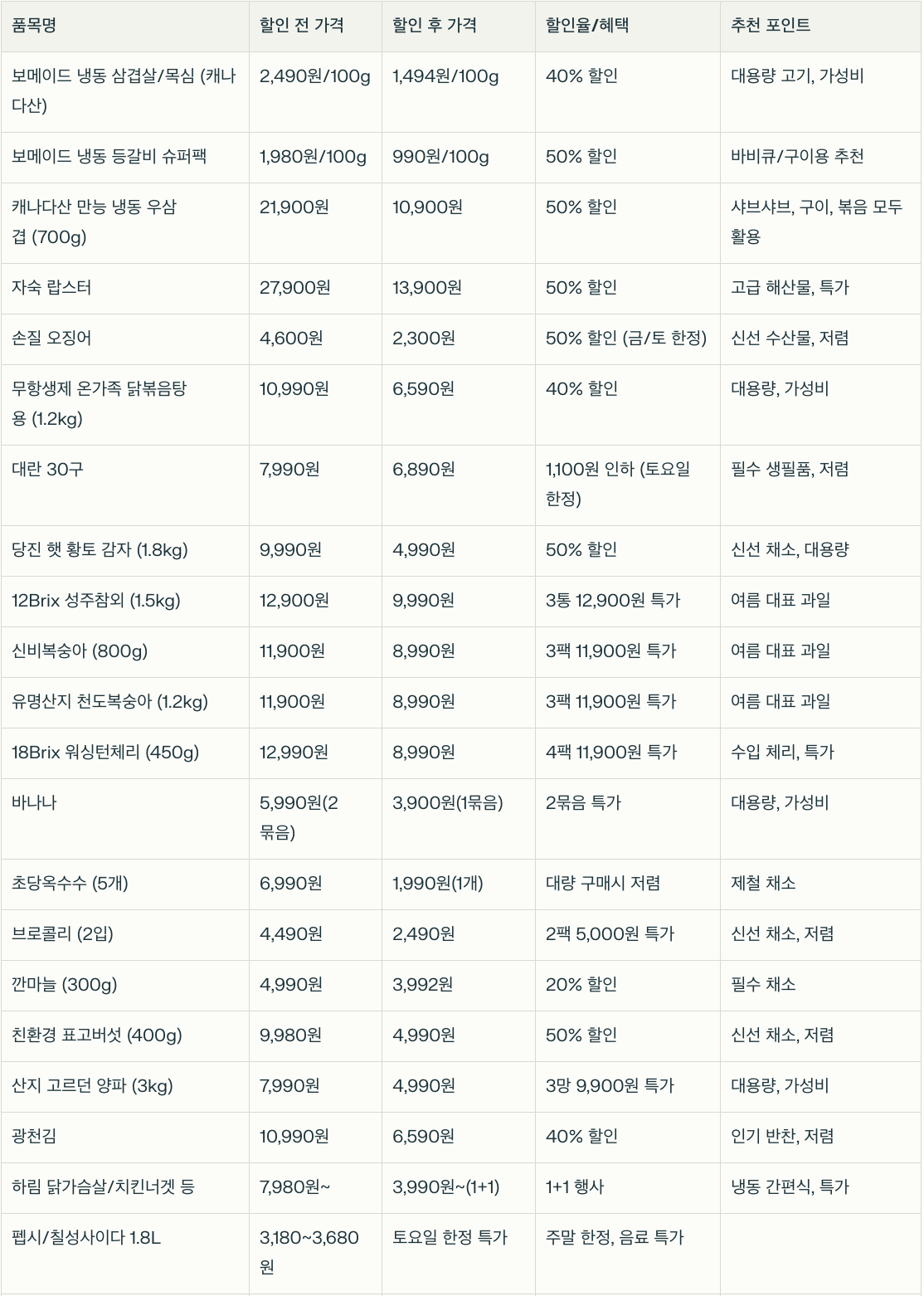 - 주말 한정: 계란, 음료, 냉동식품 등 토요일 한정 특가 품목 주목.