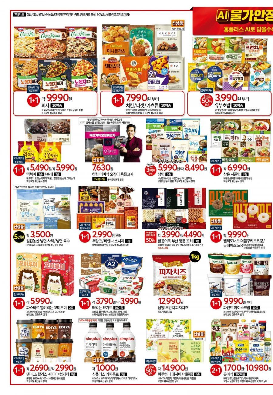 - 가공식품/생필품: 광천김, 두부, 닭가슴살, 치킨너겟, 식빵 등 1+1, 40~50% 할인.