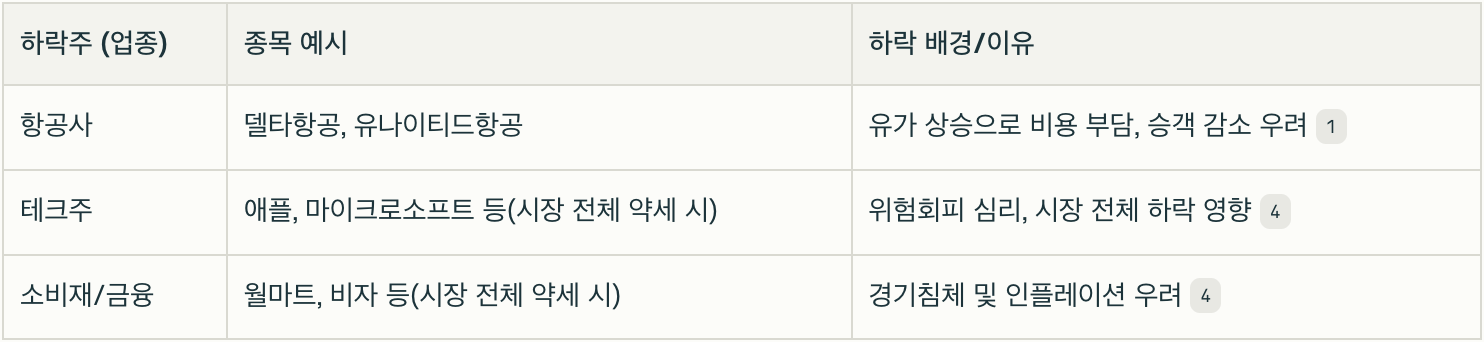 - 하락주: 항공사(델타, 유나이티드), 테크/소비재/금융(애플, 월마트, 비자 등, 시장 전체 약세 시)
