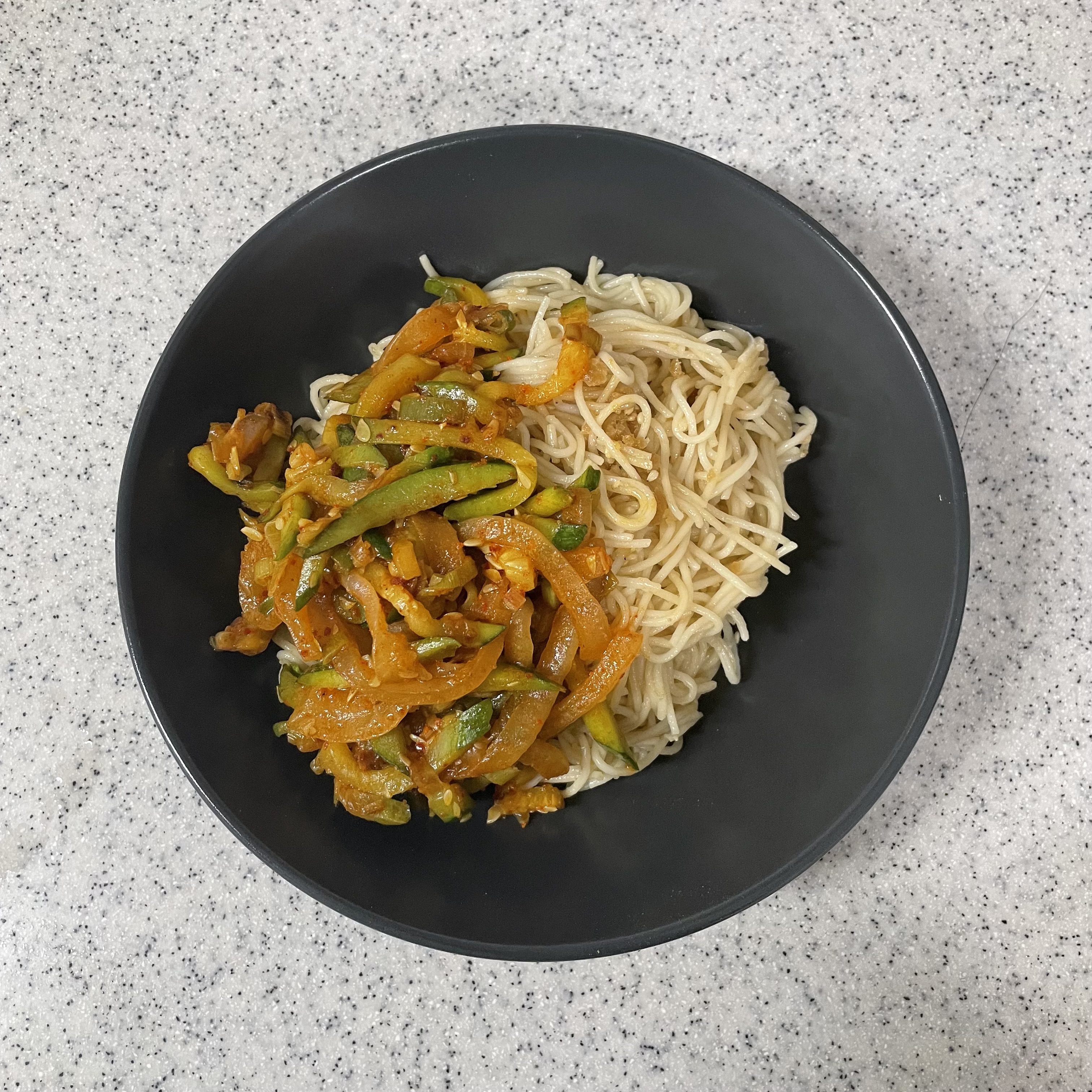 - 그릇에 양념에 버무려 놓은 국수를 담고 그 위에 볶은 애호박을 올린다.