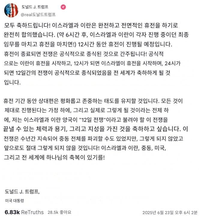 이란과 이스라엘 간의 ‘종전 합의’는 미국 트럼프 대통령의 공식 발표를 통해 전면 휴전에 합의했다고 알려졌으나, 이란 측은 여전히 공식적으로 휴전을 확인하지 않았습니다. 트럼프 대통령은 소셜미디어(트루스소셜)를 통해 “이스라엘과 이란이 완전하고 전면적인 휴전에 합의했다”고 밝혔으며, 양국이 현재 진행 중인 마지막 작전을 마무리한 후 이란이 먼저 휴전을 시작하고, 12시간 후 이스라엘이 뒤따르며, 휴전이 시작된 시점으로부터 24시간 후 전쟁이 공식적으로 종료된다고 설명했습니다.